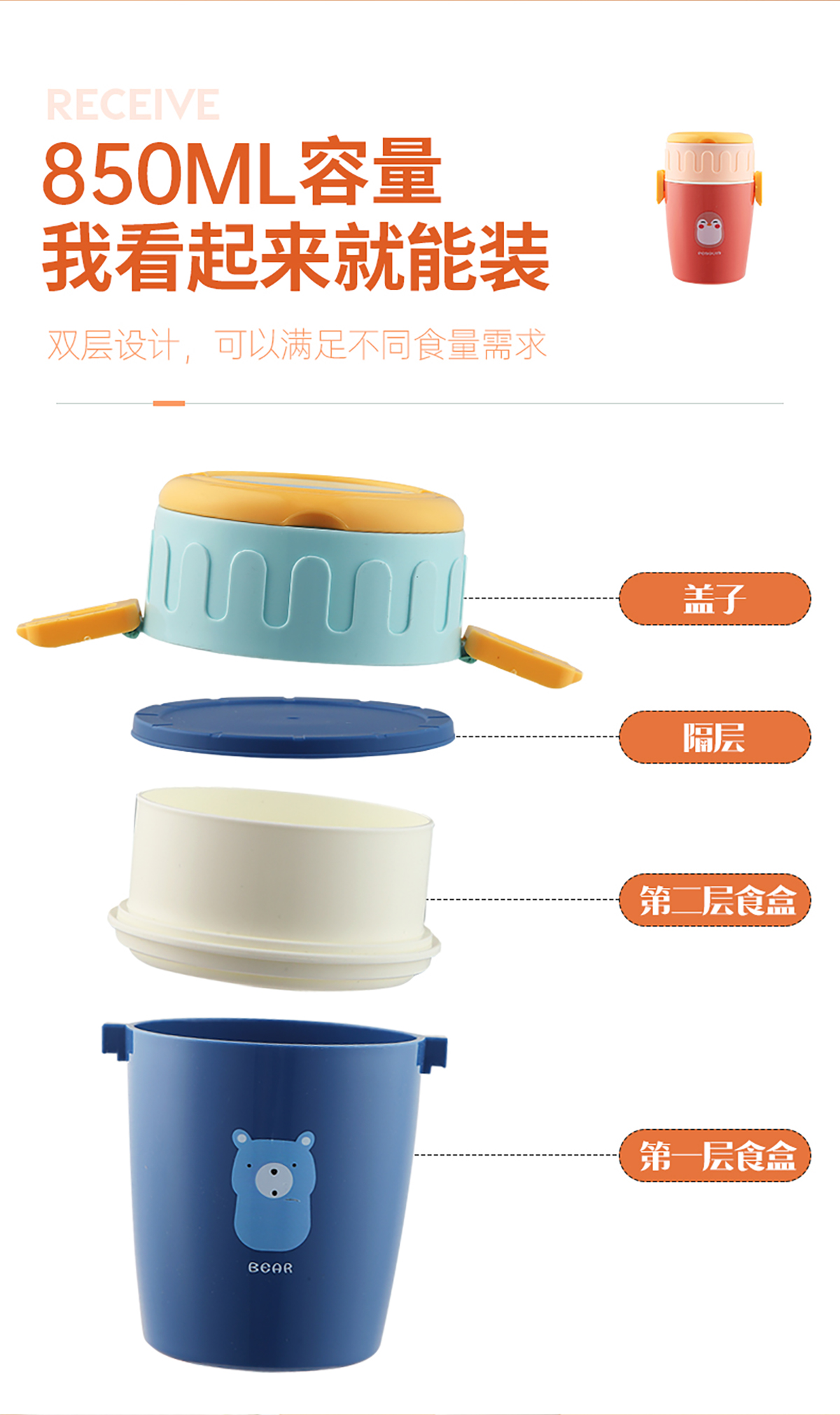 呆萌卡通雙層餐盒(圓錐形)850ml