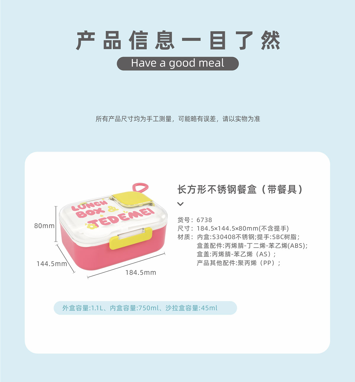 Size: 185*145*80mm/內(nèi)盒:750ml/沙拉盒:45ml/外盒:1.1L