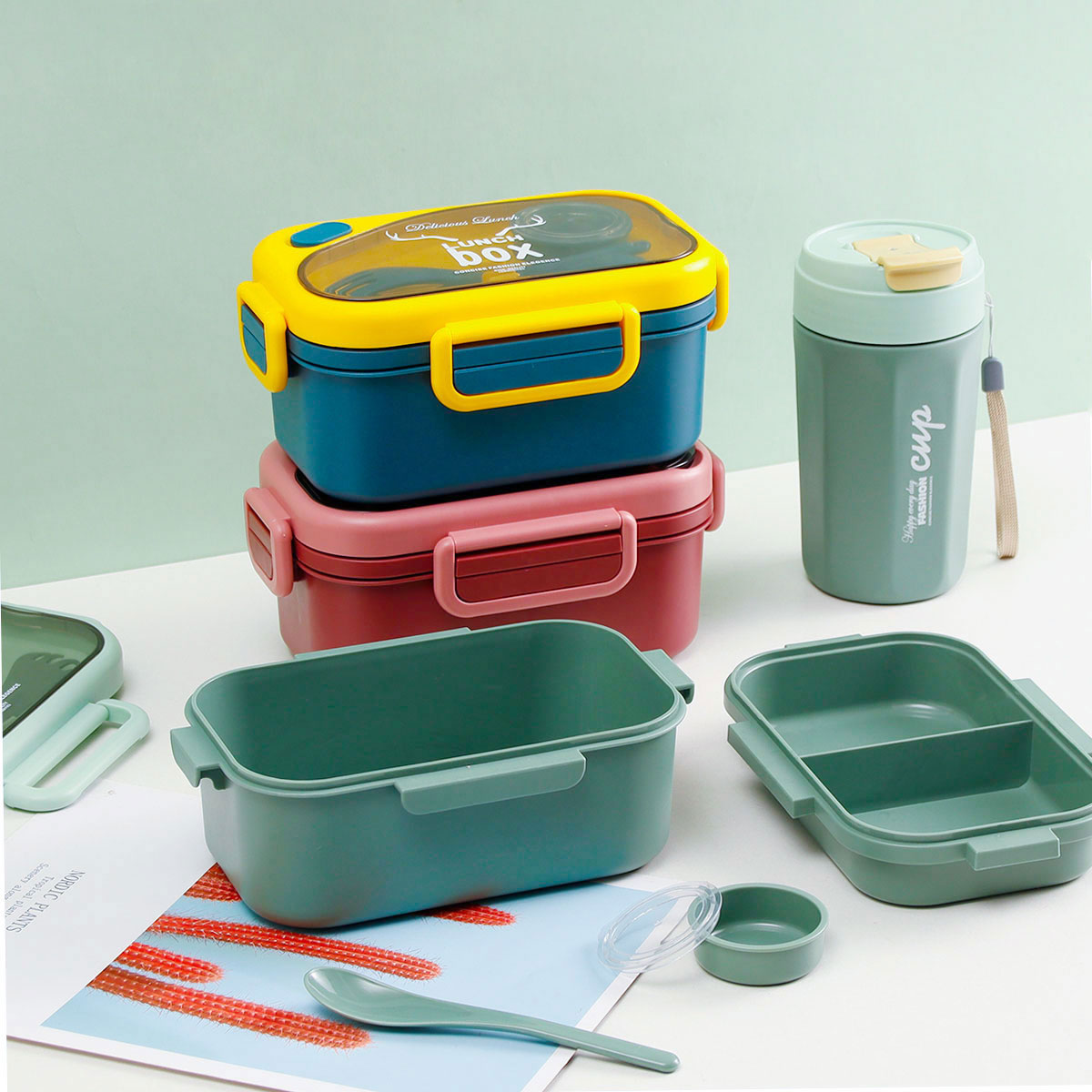 品悅長(zhǎng)方雙層密封飯盒(1100ml)(含醬料盒)+圓形/八角隨行杯(500ml)